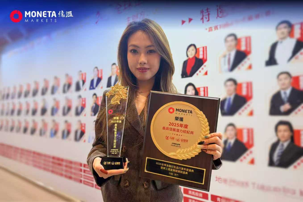在 2026 年 1 月 17 日于澳门举行的 “2026 全球金融衍生品行业年度盛典暨第三届金荣奖颁奖盛典” 上,Moneta Markets(亿汇) 荣获 「2025年度最具发展潜力经纪商」 奖项。